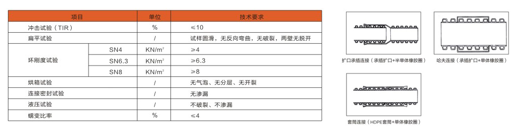 較較(HDPE)具有優(yōu)良的化學(xué)穩(wěn)定性,不易老化及耐環(huán)境應(yīng)力開裂的性能。由其為原材料生產(chǎn)出來的HDPE雙波壁紋管屬于柔性管。其主要特征如下: